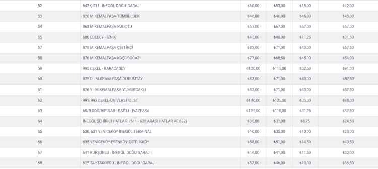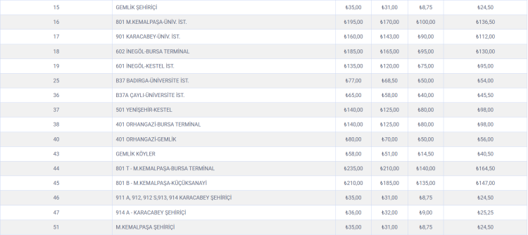 Fiyat tarifesi geceyarısı yayınlanırken toplu taşıma araçlarına çeşitli oranlarda zam yapıldığı görüldü.