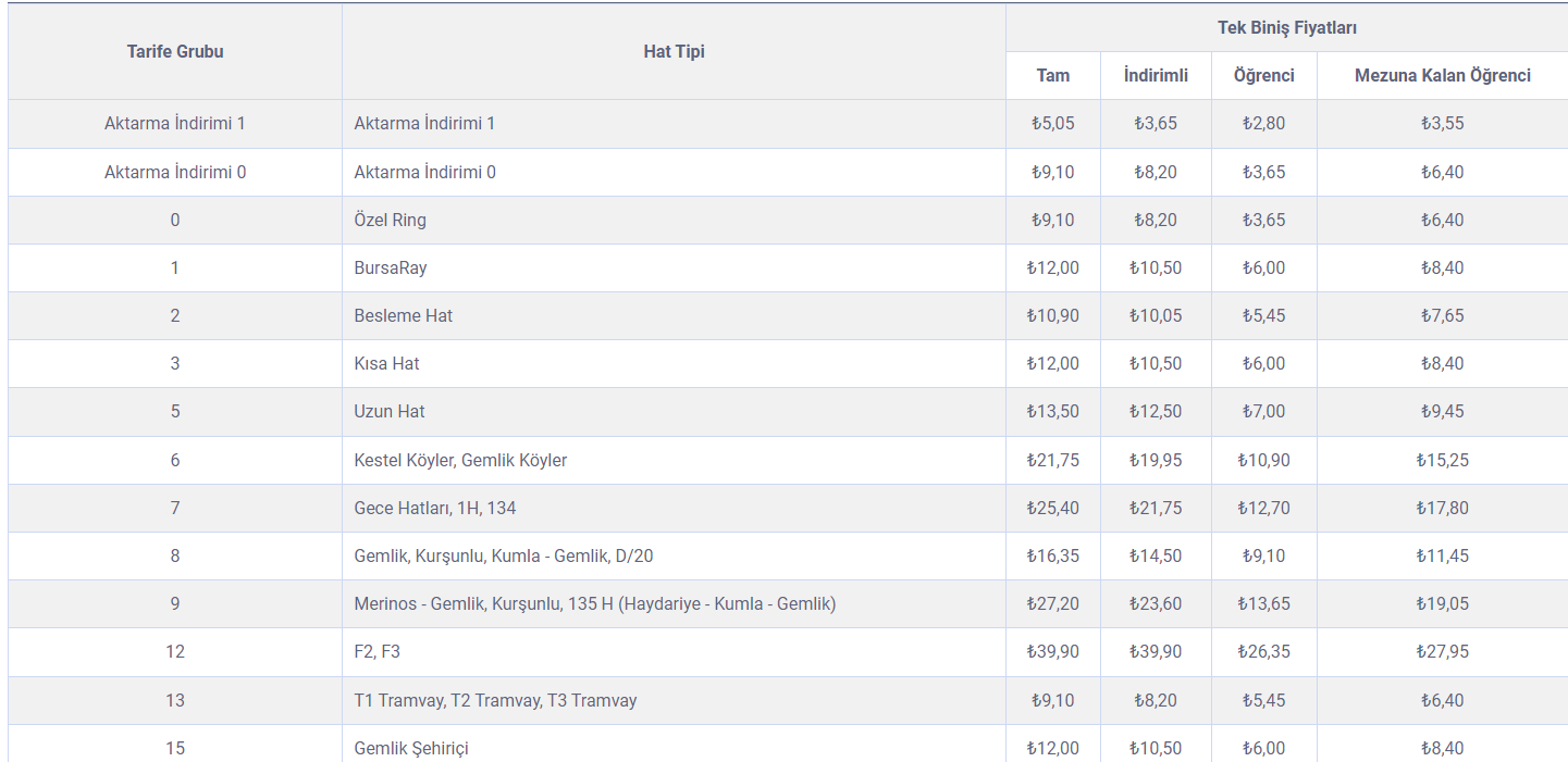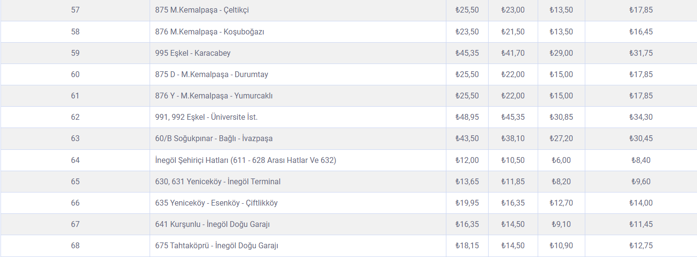 OTOBÜS KISA HAT TAM BİNİŞ 8.15 TL'den 12 TL'ye, İNDİRİMLİ 10.50 TL’ye, ÖĞRENCİ 6 TL'ye, mezuna kalan öğrenci ise 8,40 TL'ye,
