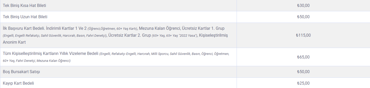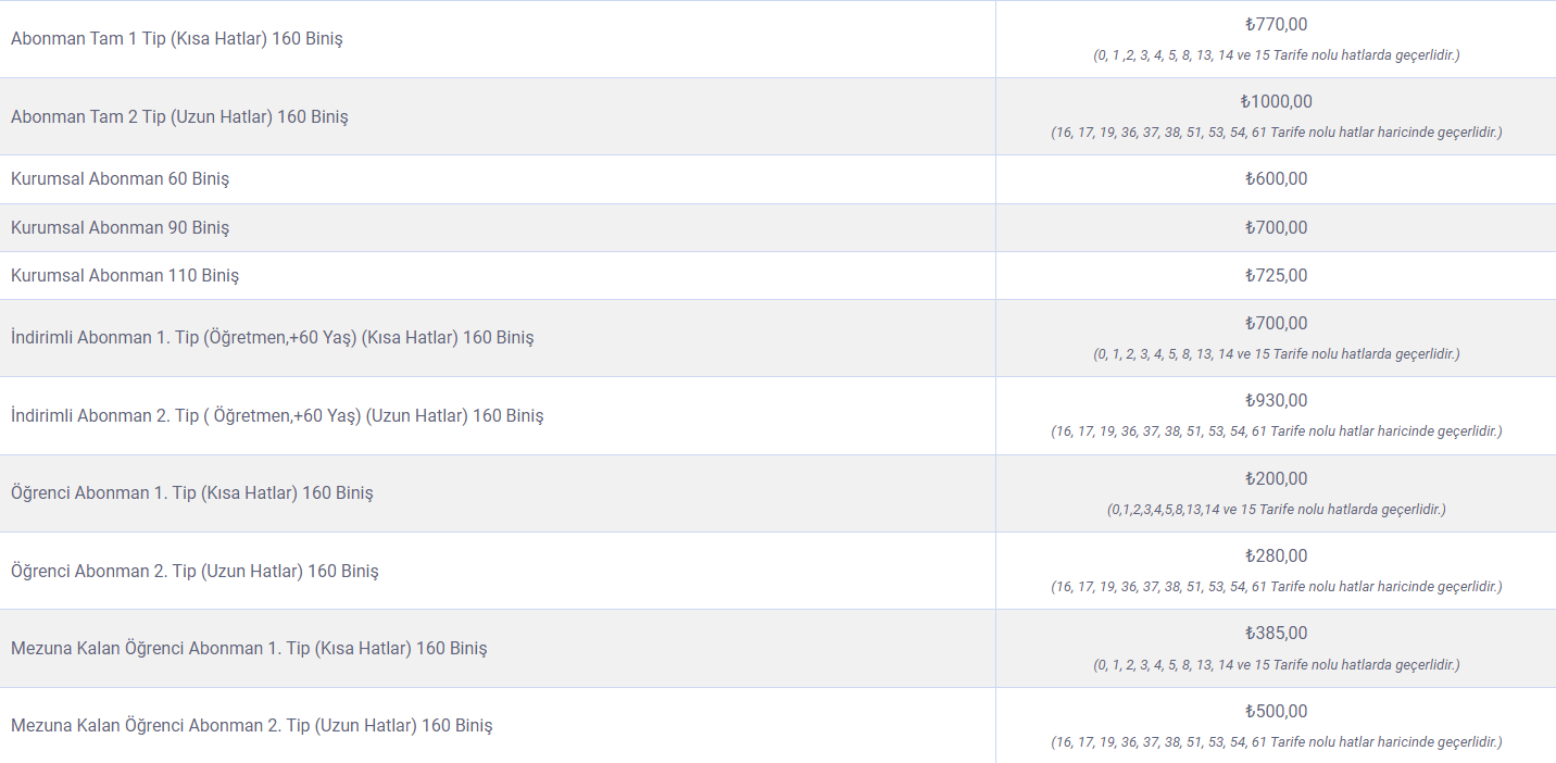 Aylık 160 binişlil ABONMAN KARTI ise kısa hatlar için 520 TL'den 770 TL'ye, uzun hatlar için 690 TL'den 1000 TL'ye yükseltildi.