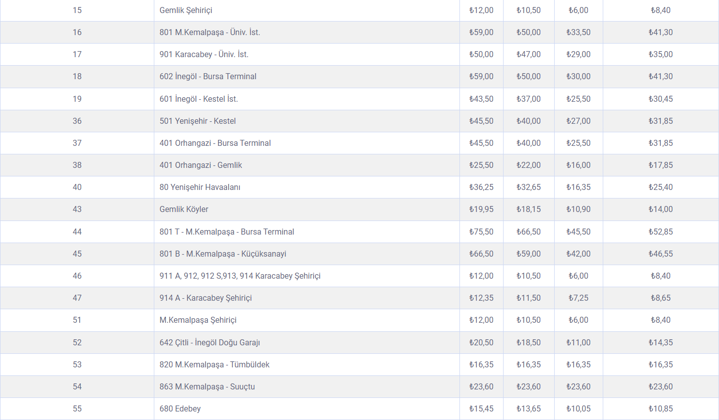 OTOBÜS UZUN HAT ise 9.40 TL'den 13,50 TL'ye, İNDİRİMLİ 12,50 TL’ye, ÖĞRENCİ 7 TL'ye, mezuna kalan öğrenci ise 9,45 TL'ye çıktı.
