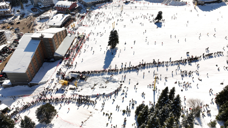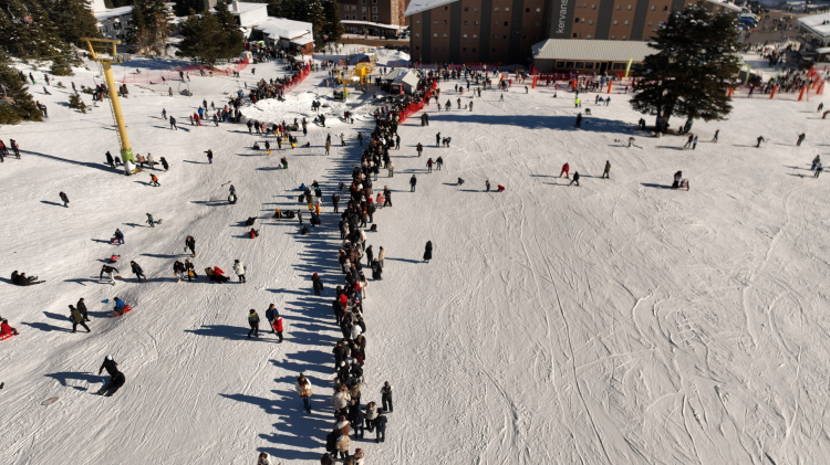 Kayak yapmak için telesiyej sırası bekleyen binlerce kişinin zirveye doğru uzanan kuyruk görüntüsü gökyüzünden bakılınca tabloları aratmadı.