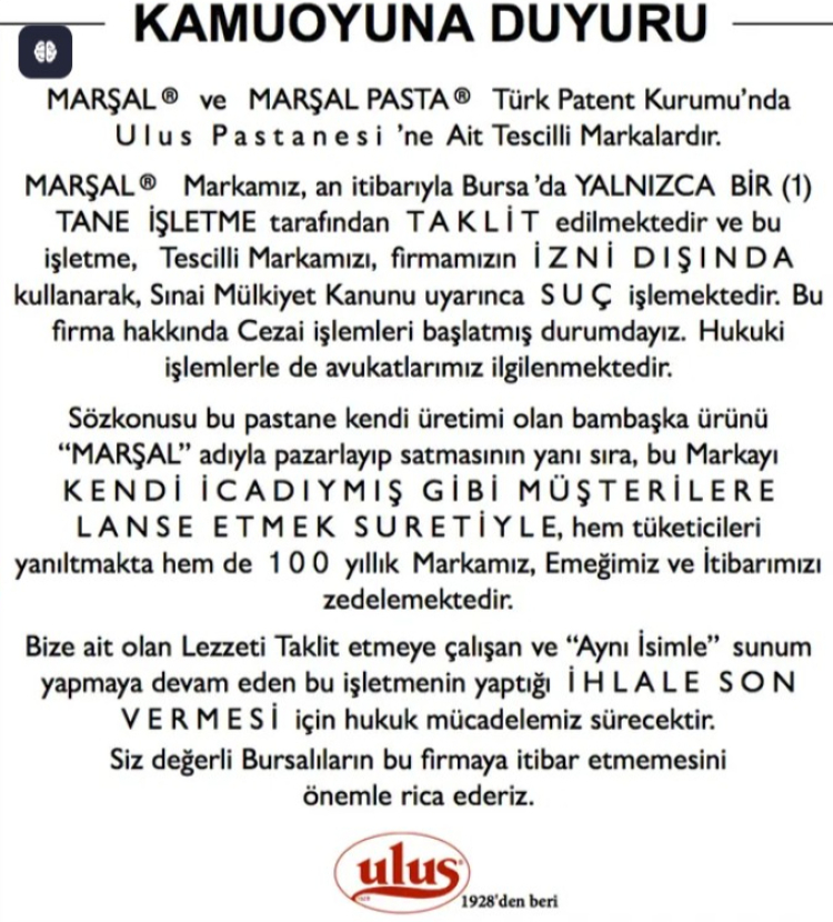 Sözkonusu bu pastane kendi üretimi olan bambaşka ürünü "MARŞAL" adıyla pazarlayıp satmasının yanı sıra, bu Markayı KENDİ İCADIYMIŞ GİBİ MÜŞTERİLERE LANSE ETMEK SURETİYLE, hem tüketicileri yanıltmakta hem de 100 yıllık Markamız, Emeğimiz ve İtibarımızı zedelemektedir.