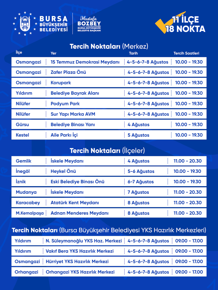 Osmangazi’de 15 Temmuz Demokrasi Meydanı, Zafer Plaza önü ve Korupark, Yıldırım’da Belediye Bayrak Alanı, Nilüfer’de Podyum Park ile Sur Yapı Marka AVM gibi yoğun noktalarda 8 Ağustos’a kadar tercih danışmanlığı hizmeti verilecek. İlçelerde ise Gemlik İskele Meydanı, İnegöl Heykel önünde 5 ve 6 Ağustos, İznik Eski Belediye Binası önünde 6 ve 7 Ağustos, Mudanya İskele Meydanı’nda 7 Ağustos, Karacabey Atatürk Kent Meydanı ve Mustafakemalpaşa Adnan Menderes Meydanı’nda ise 8 Ağustos tarihlerinde rehberlik desteği sağlanacak. Ayrıca Yıldırım Naim Süleymanoğlu ve Vakıf YKS Hazırlık Merkezleri, Osmangazi Hürriyet YKS Hazırlık Merkezi ile Orhangazi YKS Hazırlık Merkezi’nde de danışmanlık hizmeti veriliyor.