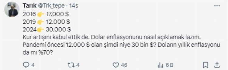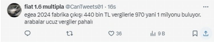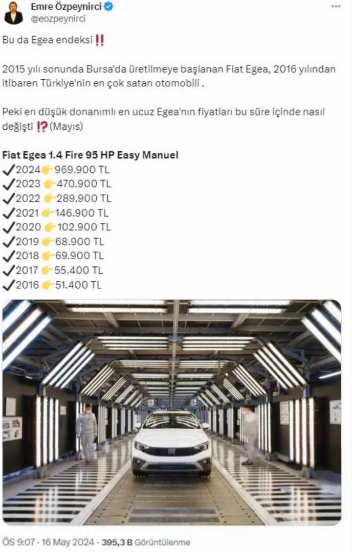 Peynirci, 2016 yılında 51 bin 400 TL'den satışa sunulan Fiat Egea 1.4 Fire 95 HP Easy Manuel'in 2024 yılında yüzde 1786 artışla 969 bin 900 TL'den satıldığını yazdı.