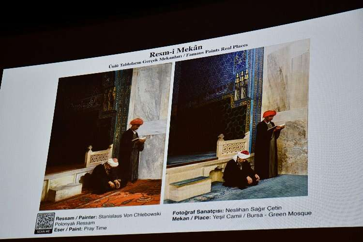 Osman Hamdi Bey başta olmak üzere dünyaca ünlü bazı ressamların eserlerini, yapıldığı mekanlarda, dönemin kıyafetlerini giyen modellerle canlandırarak fotoğraflarını çeken Neslihan Sağır Çetin, Prof. Dr. Mete Cengiz Kültür Merkezi'ndeki programda, 41 ayrı resim ve fotoğrafın öyküsü hakkında bilgi verdi.