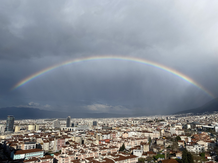Bursa'da etkili olan yağışın ardından ortaya çıkan gökkuşağı görsel şölen oluşturdu.