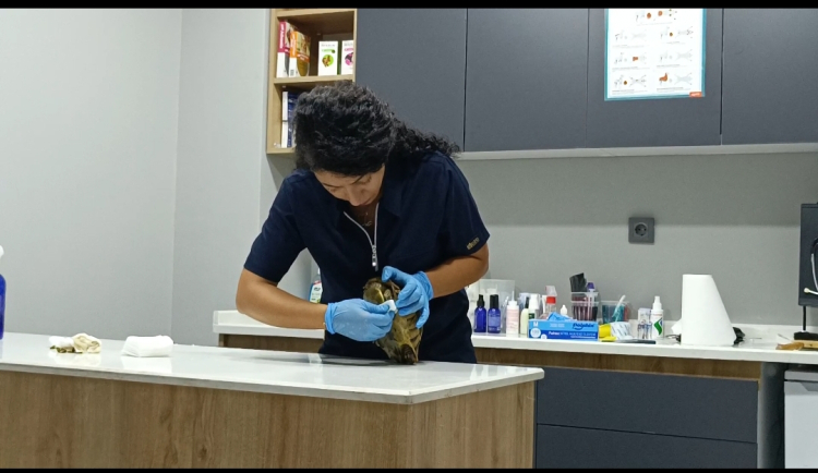 Kaplumbağanın kliniğe getirildiğinde çok kötü durumda olduğunu söyleyen Veteriner Hekim Emel Bacaksız Ölmeztürk, “Bu kaplumbağamız Harmancık yangınından, HEPAD ve HAYTAP ekiplerinin çalışmasıyla kurtarıldı. Kliniğimize ulaştırıldığında çok kötü durumdaydı. Özellikle ön kolları ve arka bacaklarının üst kabuk kısmında, derin yanık izleri vardı. Ön ayaklardaki deriler tamamen yanmıştı. Günlük pansumanlarını yapıyor, ilaç tedavisi uyguluyoruz” dedi.