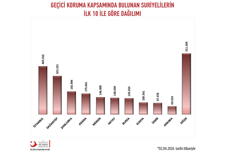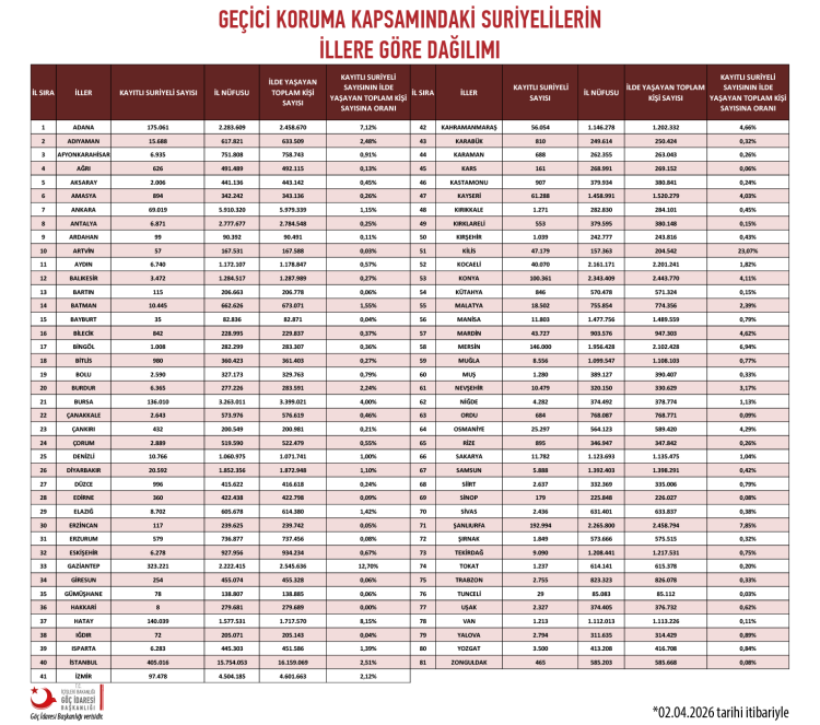 5 Şubat 2026 itibarıyla 138 bin seviyesinde olan Suriyeli nüfus, 2 Nisan 2026 tarihli güncel verilere göre 136 bin 10’a geriledi.