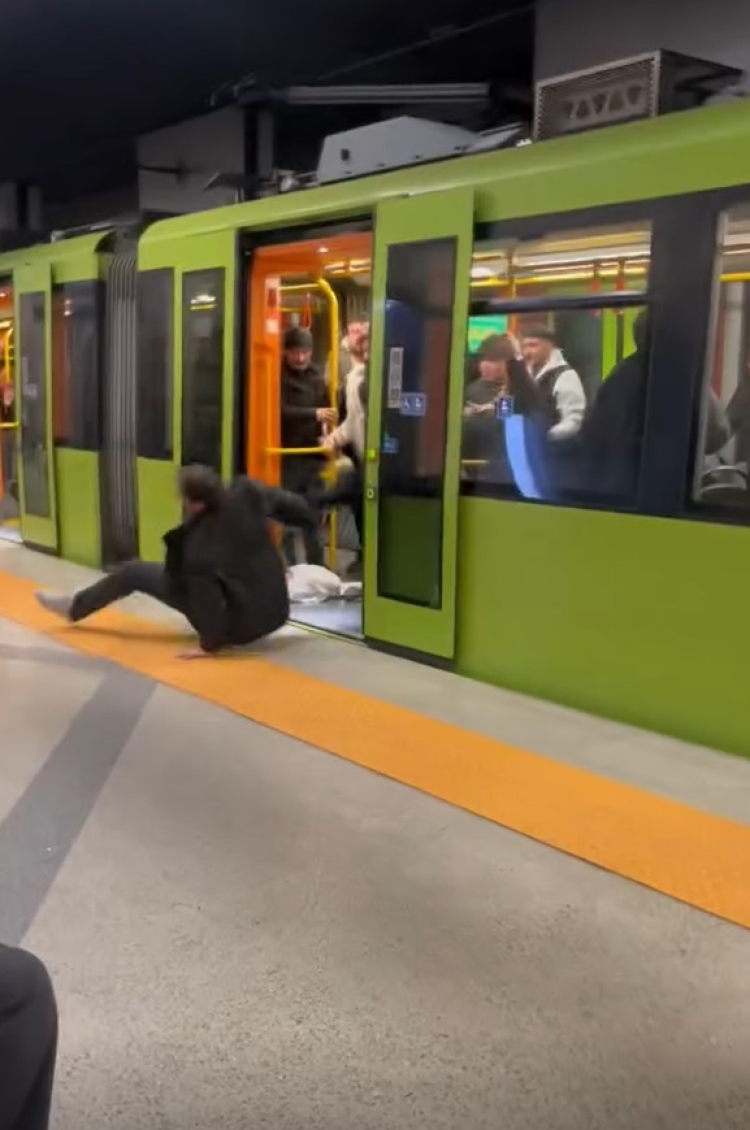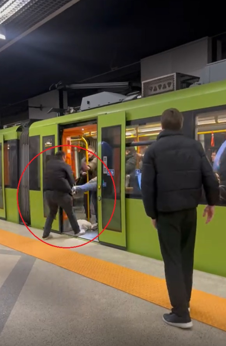 Görüntülerde, metronun içinde darbedilen yolcunun, vagonun kapıları açıldığında, diğer yolcular tarafından tekmelenerek dışarı atıldığı, elindeki poşetlerin de yere düştüğü görüldü.