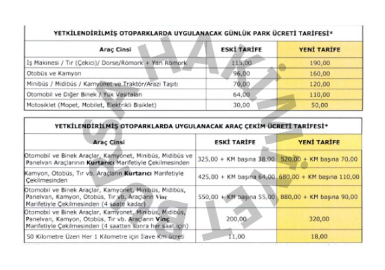 Yetkilendirilmiş otoparklarda uygulanacak günlük park ücreti tarifesi yüzde 65 ila 71 arasında; araç çekim ücreti ise yüzde 60 ila 84 arasında değişen oranlarda zamlandı.