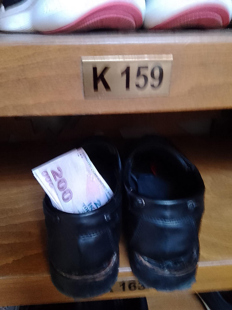Bursa'da henüz nerede yaşandığı bilinmeyen olayda bir vatandaş camide ayakkabılıkta gördüğü yırtık ayakkabıların içine bir tomar bıraktı.