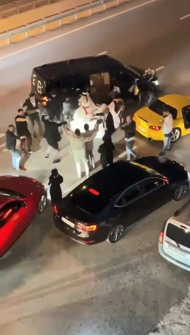 Düğün konvoyundaki araçlar, Bursa-Mudanya yolu Tepedevrent mevkiinde yolun ortasında durdu. İki şeridi kapatıp oynamaya başlayan konvoydaki vatandaşlar, trafiğe aldırış etmedi.