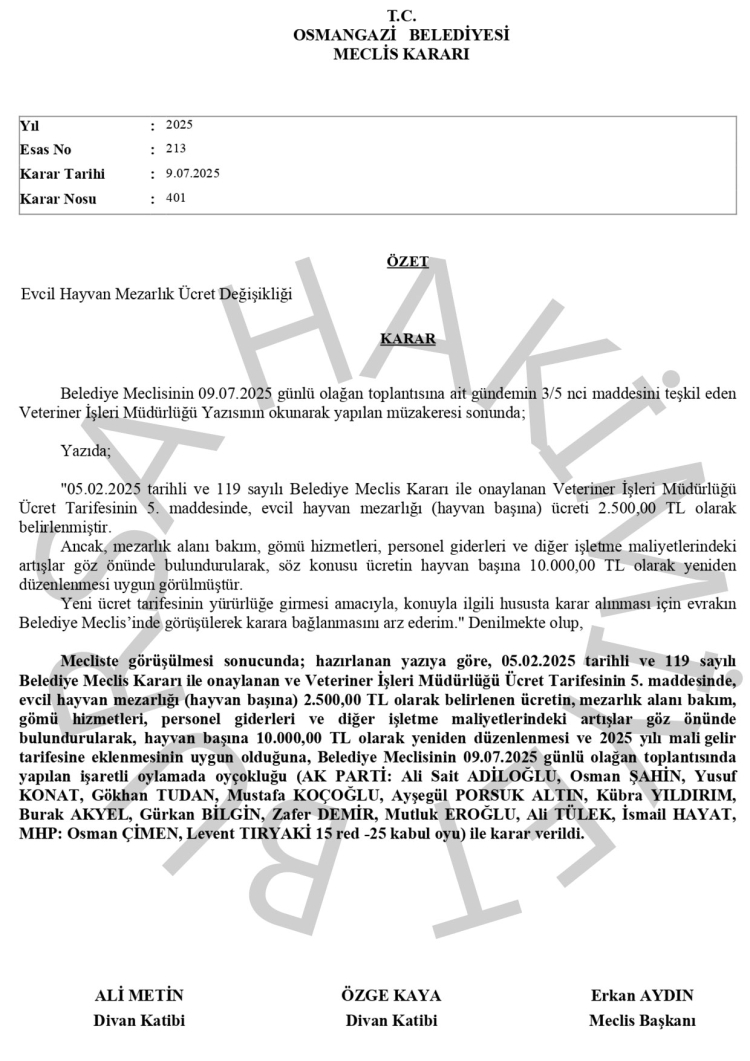 Osmangazi Belediyei Meclisi, Temmuz ayı toplantısında Veteriner İşleri Müdürlüğü'nün evcil hayvan mezarlarıyla ilgili yazısını görüştü.