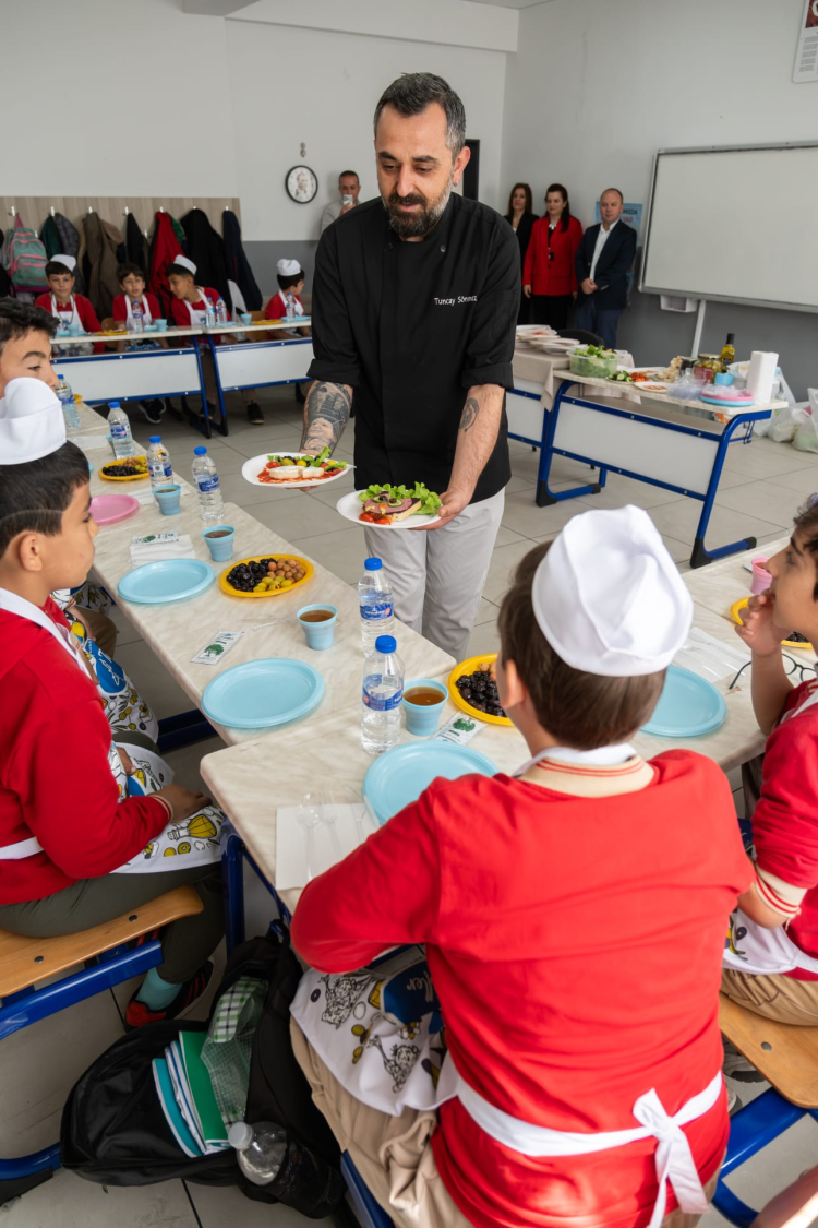 Etkinliğin odağında yer alan Bursa gastronomisinin önemli isimlerinden Tuncay Şef, sınıf ortamında adeta bir mutfak kurgulayarak minik şeflerle birlikte zeytinli tarifler hazırladı. Uygulamalı anlatımıyla çocuklara rehberlik eden Tuncay Şef, tariflerin püf noktalarını paylaşırken öğrencilerin sürece aktif katılımı etkinliğe ayrı bir dinamizm kattı.