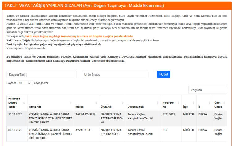Yeryüzü Ambalaj Gıda Tarım Temizlik İnşaat Sanayi Ticaret Limited Şirketi'nin Tarım Ayvalık markalı naturel sızma zeytinyağlarında tohum yağı tespit edildi.