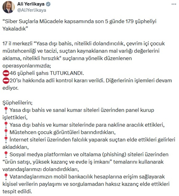 "Siber suçlarla mücadele kapsamında son 5 günde 179 şüpheliyi yakaladık. 17 il merkezli 'Yasa dışı bahis, nitelikli dolandırıcılık, çevrim içi çocuk müstehcenliği ve tacizi, suçtan kaynaklanan mal varlığı değerlerini aklama, nitelikli hırsızlık' suçlarına yönelik düzenlenen operasyonlarımızda, 46 şüpheli şahıs tutuklandı. 20'si hakkında adli kontrol kararı verildi. Diğerlerinin işlemleri devam ediyor. Konya, Erzurum, Tekirdağ, Niğde, Şanlıurfa, İzmir, Mersin, Tokat, Eskişehir, Gaziantep, Kocaeli, Artvin, Sinop, İstanbul, Aksaray, Antalya, Bursa merkezli Mardin, Adana, Karaman, Sivas, Osmaniye, Diyarbakır, Balıkesir, Ordu, Kilis, Manisa, Hatay, Ankara, Aydın, Bingöl, Kahramanmaraş, Çorum, Edirne, Hakkari, Kırklareli ve Malatya'da gerçekleştirilen operasyonlarda yakalanan şüphelilerin, 7545 sayılı Siber Güvenlik Kanunu'na muhalefet, bilişim sistemlerinin araç olarak kullanılması suretiyle nitelikli dolandırıcılık, yasa dışı bahis, çevrim içi çocuk müstehcenliği, bilişim sistemine girme, nitelikli hırsızlık, suç işlemek amacıyla örgüt kurma ve örgüte üye olma, suçtan kaynaklanan mal varlığı değerlerinin aklanması suçlarından savcılıklarımızca haklarında soruşturma başlatıldı. Yaklaşık 107 milyon lira değerinde 2 araç, 2 deniz aracı ile 2 şirkete el konuldu."