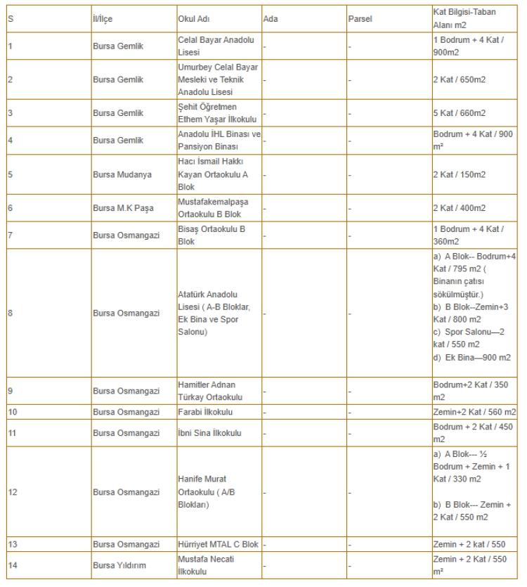 Bursa'nın Gemlik, Osmangazi, Mudanya, Mustafakemalpaşa ve Yıldırım ilçelerindeki 14 okulun hurda karşılığı yıkımı için ihale açıldı.