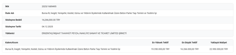 Bursa Büyükşehir Belediyesi Destek Hizmetleri Dairesi Başkanlığı İhale Şube Müdürlüğü, İnegöl, Yenişehir, Kestel, Gürsu ve Yıldırım ilçelerinde kullanmak için açtığı parke taşı ihalesi sonuçlandı.