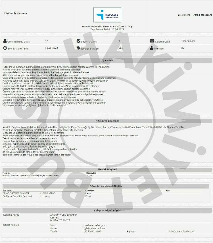 Bursa Kestel Organize Sanayi Bölgesi'nde 5500 m2’si kapalı olmak üzere 8000 m2’lik alanda, kağıt ve plastik ambalaj malzeme üretimi yapan dev fabrika art arda ilan yayımladı.