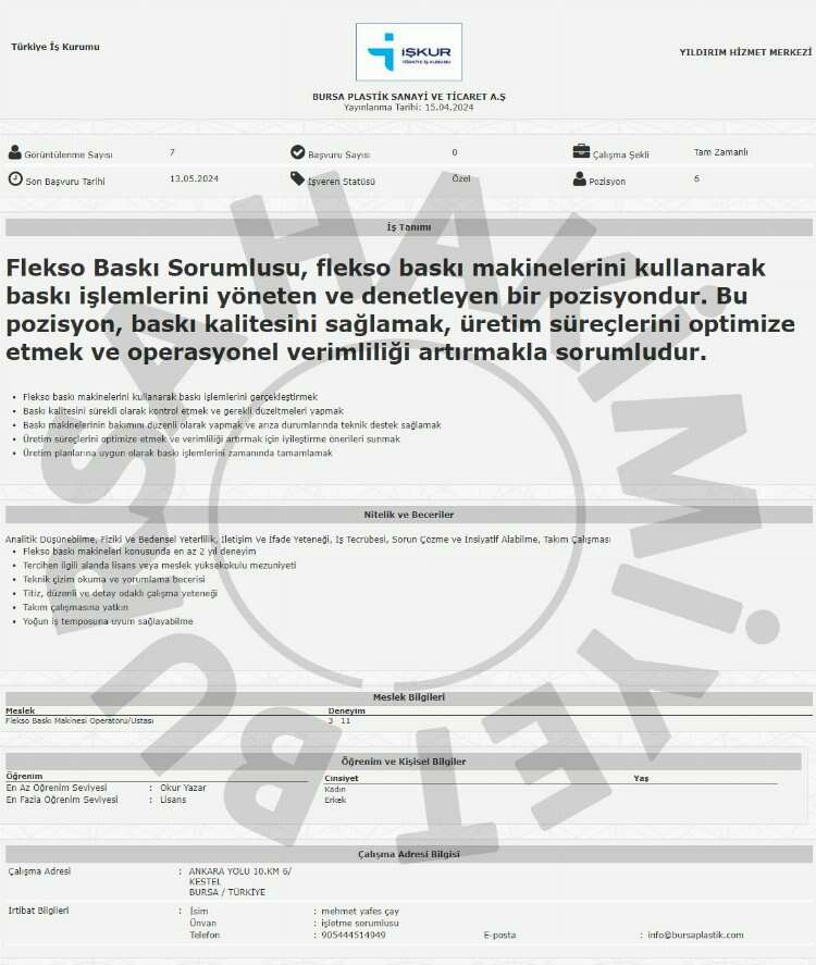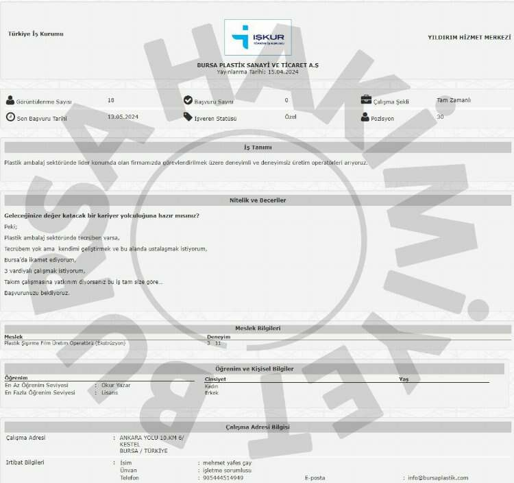 Kestel'deki dev fabrikada çalışma üzere 20 Bodinoz Makinesi Operatörü/ Ambalaj-Poşet İmalat Ustası, 6 Flekso Baskı Makinesi Operatörü/Ustası ve 30 Plastik Şişirme Film Üretim Operatörü(Ekstrüzyon) istihdam edilecek.