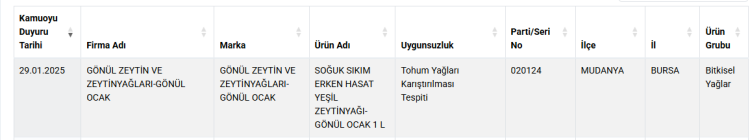 Bakanlığın internet sitesinde yer alan bilgilere göre, Mudanya'da faaliyet gösteren Gönül Zeytin Ve Zeytinyağları adlı işletmenin Soğuk sıkım erken hasat yeşil zeytinyağında tağşiş yapıldığı ortaya çıktı.