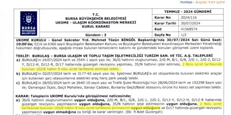UKOME, 2 nolu ücret tarifesinde bulunan 102/E hattının 9 nolu ücret tarifesine alınması talebini görüştü.
