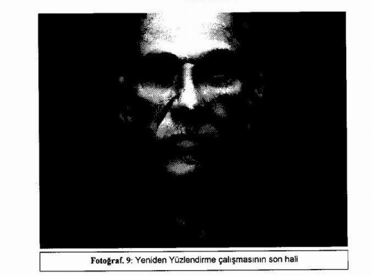 Polis kriminal ekipleri, cesede ait 87 adet kemik ile 2 adet diş protezi üzerinde yaptığı çalışmalarda erkek cinsiyetine ait olduğu, yaşının 40-66 yaş aralığında, 166-172 cm boylarında olduğu belirlerken dijital ortamda cesete ait yüz giydirme işlemi yapılarak rapor hazırladı.