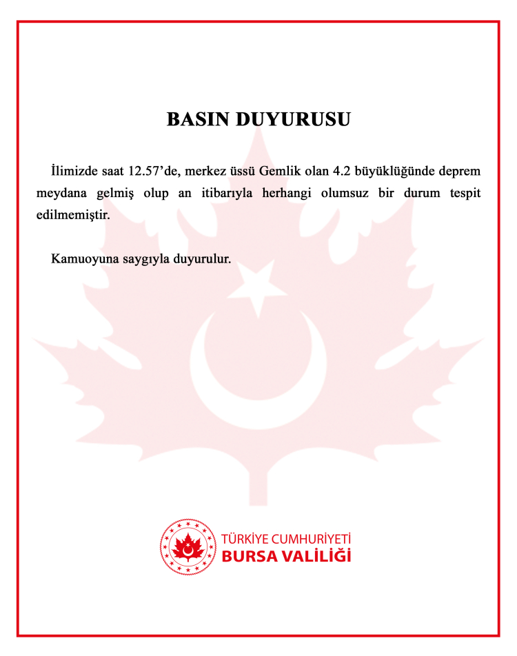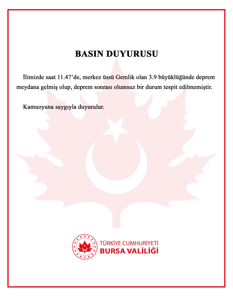 İlimizde saat 11.47'de ve saat 12.57'de merkez üssü Gemlik olan 3.9 ve 4.2 büyüklüğünde depremler meydana gelmiş olup, deprem sonrası olumsuz bir durum tespit edilmemiştir. Kamuoyuna saygıyla duyurulur.