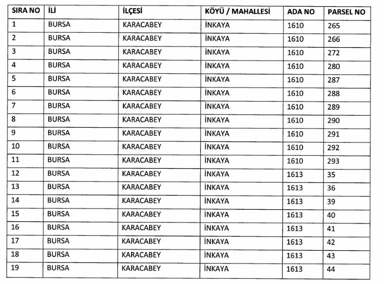 Söz konusu kamulaştırma listesinde yer alana taşınmazlar ada ve parsel numaralarıyla tek tek yayımlandı.