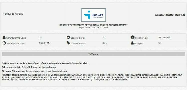 Bursa'nın en büyük firmaları listesinde ilk sıralarda bulunan RB Karesi Holding'e bağlı Karesi Polyester ve Petrokimya Sanayi Anonim Şirketi, İŞKUR üzerinden yayımladığı ilanlarla 41 personel alacak.