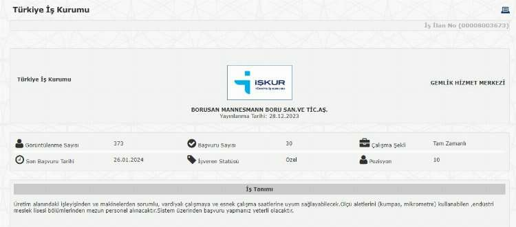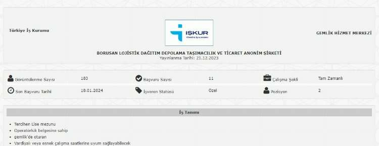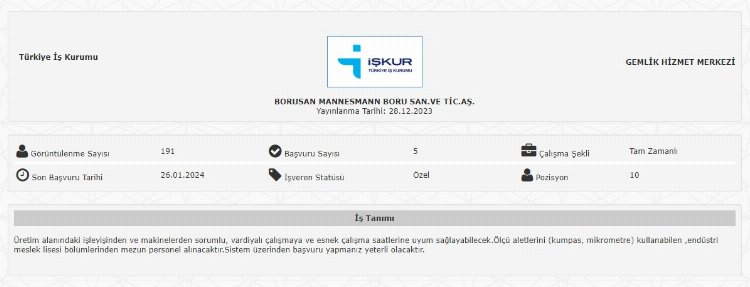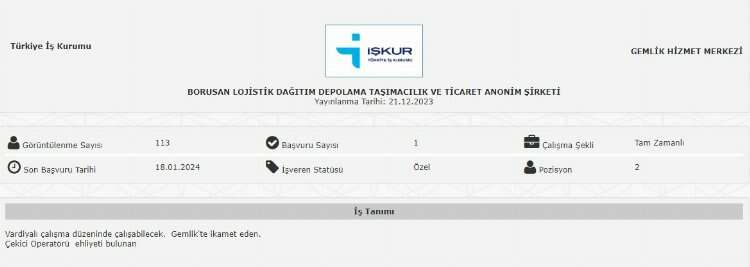Yayımlanan ilanlara göre; 2 Terminal Çekici Operatörü, 2 Forklift Operatörü, 10 Metal Mamuller Montaj İşçisi ve 10 Beden İşçisi (Genel) istihdam edilecek.
