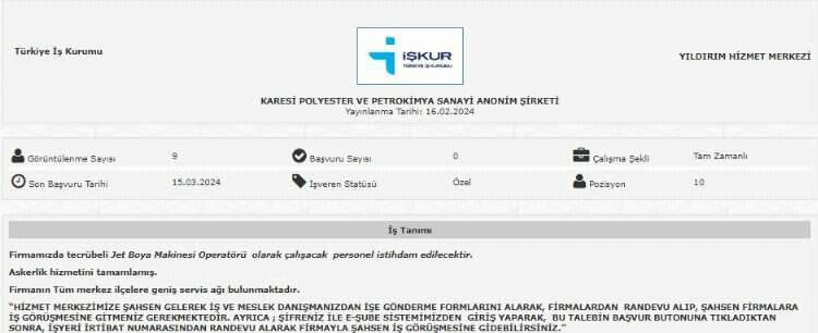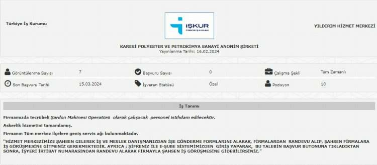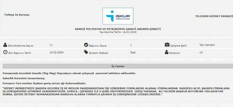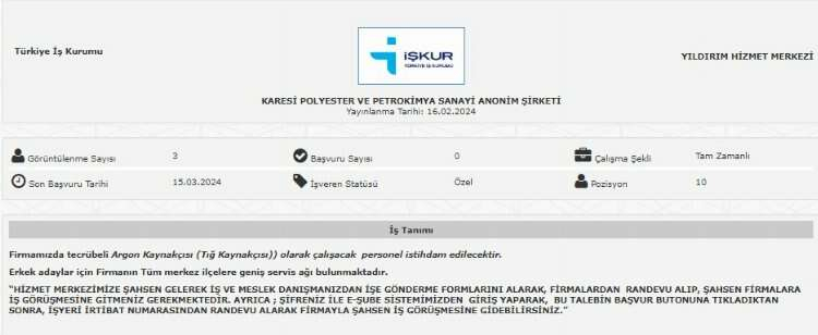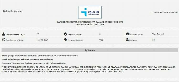 Bursa'nın en büyük firmaları listesinde ilk sıralarda bulunan RB Karesi Holding'e bağlı Karesi Polyester ve Petrokimya Sanayi Anonim Şirketi, İŞKUR üzerinden yayımladığı ilanlarla 90 personel alacak.