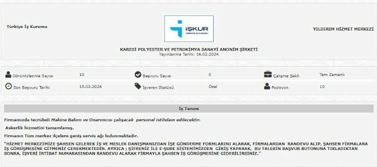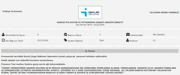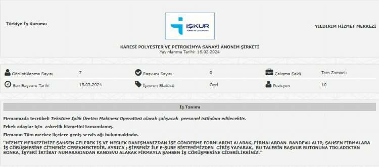 Yayımlanan ilanlara göre; Örme Operatörü (Nezaretçi/Ustabaşı), Şardon Makinesi Operatörü, Jet Boya Makinesi Operatörü, Ram Makinesi Operatörü (Tekstil), Konik Çözgü Makinesi Operatörü, Tekstüre İplik Üretim Makinesi Operatörü, Makine Bakım ve Onarımcısı, Gazaltı Kaynakçısı (Mıg-Mag Kaynakçısı) ve Argon Kaynakçısı (TİG Kaynakçısı) alınacak.