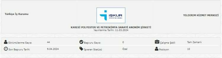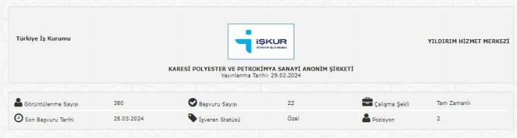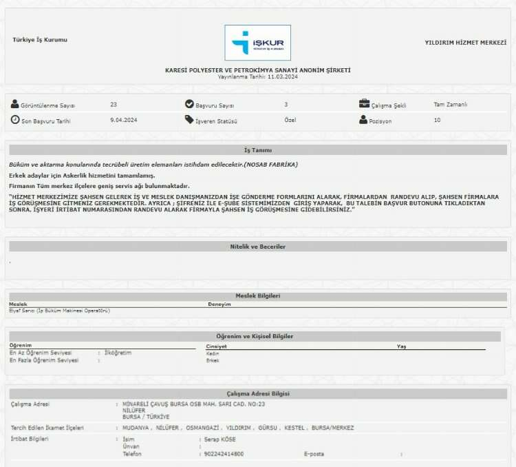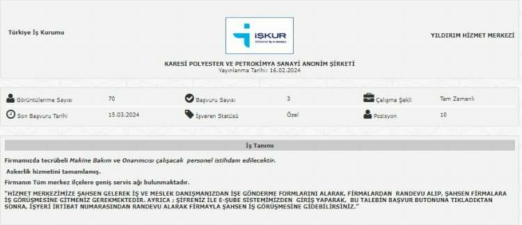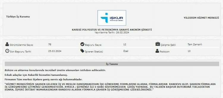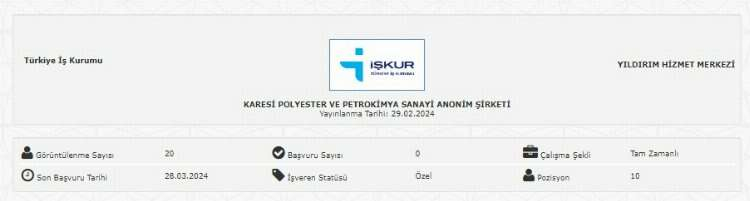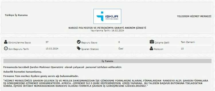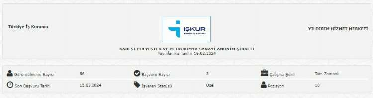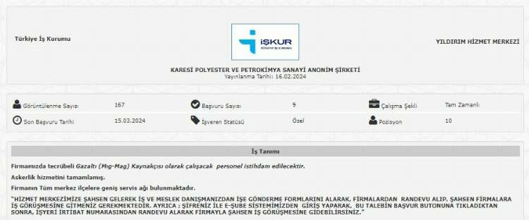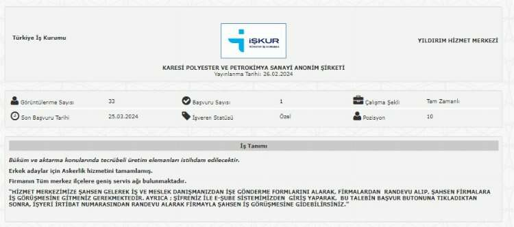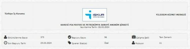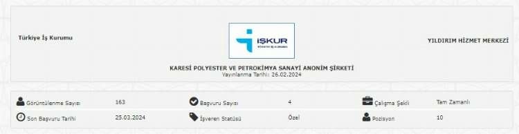Bursa'nın en büyük firmaları listesinde ilk sıralarda bulunan RB Karesi Holding'e bağlı Karesi Polyester ve Petrokimya Sanayi Anonim Şirketi, İŞKUR üzerinden yayımladığı ilanlarla 178 işçi alacak.