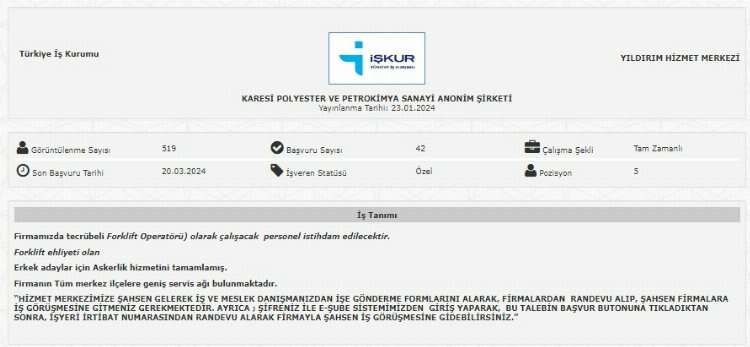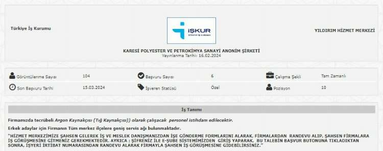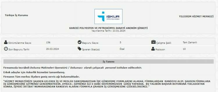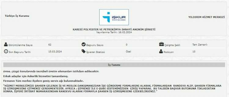 Yayımlanan ilanlara göre;Elyaf Sarıcı (İp Büküm Makinesi Operatörü), Bobin Aktarma İşçisi, Dokumacı/Endüstriyel Dokumacı, Tekstüre İplik Üretim Makinesi Operatörü, Örme Operatörü (Nezaretçi/Ustabaşı), Forklift Operatörü, Şoför-Yük Taşıma, Beden İşçisi (Genel), Bobin-Katlama-Büküm Makine Operatörü, Makine Bakım ve Onarımcısı, Şardon Makinesi Operatörü, Argon Kaynakçısı (TİG Kaynakçısı) ve Gazaltı Kaynakçısı (Mıg-Mag Kaynakçısı) alınacak.