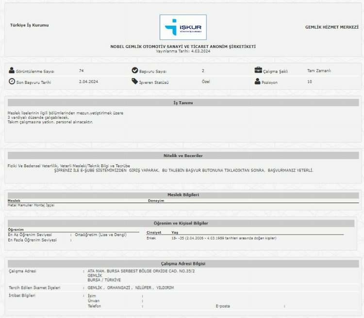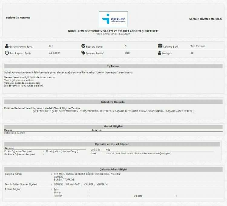 Nobel Gemlik Otomotiv Sanayi Ve Ticaret Anonim Şirketi, Barutçu Tekstil Sanayi Ve Ticaret Anonim Şirketi, Sirena Marine Denizcilik Sanayi Ve Ticaret Anonim Şirketi, Işıksoy Tekstil İnşaat Taahhüt Sanayi Ve Ticaret Anonim Şirketi, MD Ritim Tekstil İnşaat Sanayi Ve Ticaret Limited Şirketi, Ramazan Ay Ay İplikçilik Ve Tekstil Sanayi Ve Ticaret Limited Şirketi ve Cansan Alüminyum Profil Sanayi Ve Ticaret Anonim Şirketi adlı firmalar çok sayıda işçi almak için art arda ilan verdi.