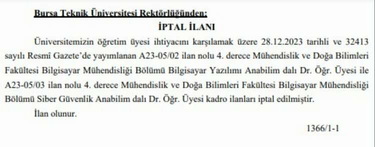 Bursa Teknik Üniversitesi, 2 akademik kadro için verdiği ilanların iptal edildiğini açıkladı.