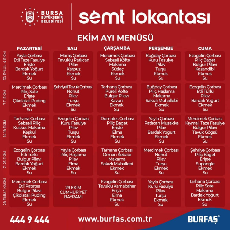 BURSA BÜYÜKŞEHİR BELEDİYESİ SEMT LOKANTASI EKİM AYI MENÜSÜ