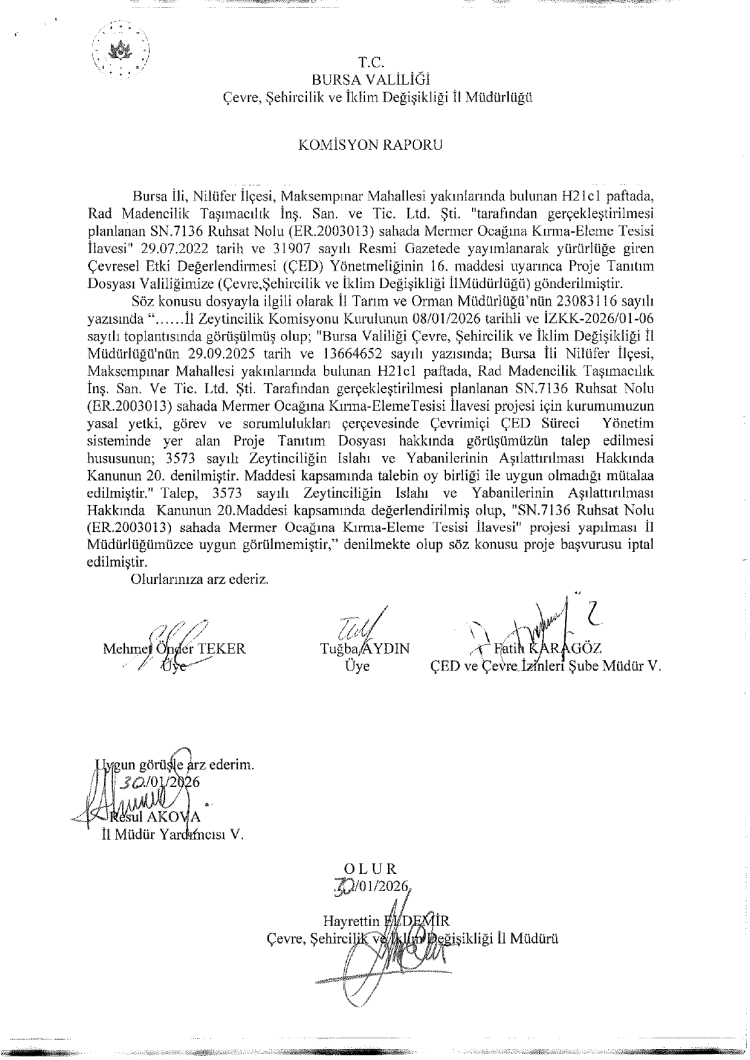 Ancak Bursa Valiliği Çevre, Şehircilik ve İklim Değişikliği İl Müdürlüğü bünyesinde hazırlanan komisyon raporunda, projenin ilgili mevzuat kapsamında uygun görülmediği ifade edildi.