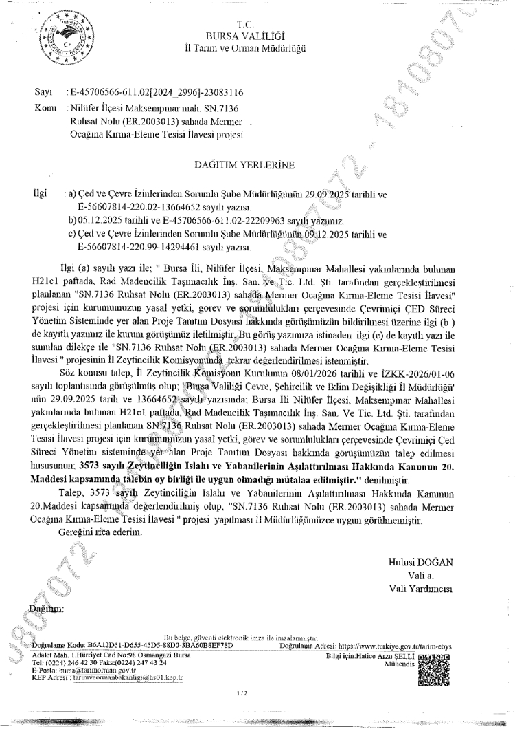 Nilüfer ilçesine bağlı Maksempınar Mahallesi’nde Rad Madencilik Taşımacılık İnşaat Sanayi ve Ticaret Ltd. Şti. tarafından planlanan “Mermer Ocağı Kırma-Eleme Tesisi İlavesi” projesine ilişkin ÇED başvurusu iptal edildi.