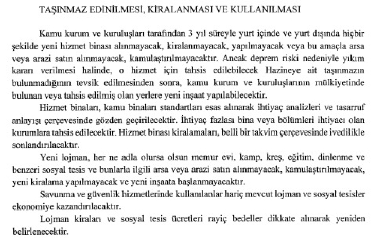 Doğal afet ve güvenlikle ilgili olanlar hariç, yeni lojman ve sosyal tesis alımını, yapımını ve kiralanmasını süresiz kaldırıyoruz. Savunma ve güvenlik hariç, mevcut sosyal tesisleri ekonomiye kazandıracağız. Lojman kiralarını ve sosyal tesis ücretlerini rayiç bedelleri dikkate alarak gözden geçireceğiz.