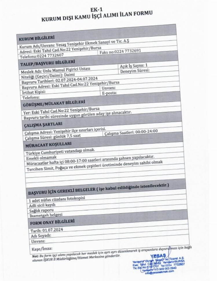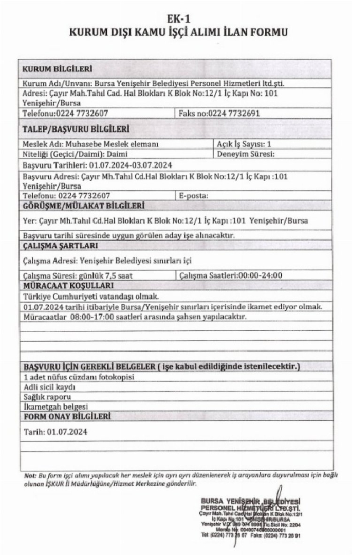 Bursa Yenişehir Belediyesi Personel Hizmetleri Limited Şirketi ve Yenişehir Ekmek Sanayi ve Ticaret Anonim şirketii KPSS şartı olmadan en az 31 bin TL maaşla çok sayıda çalışan alacağını bildirdi.
