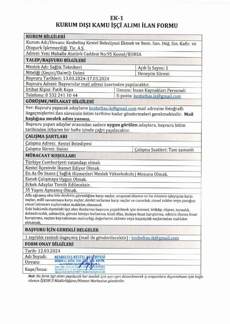 Belediye bünyesinde istihdam edilecek Büro Personeli, Kütüphane Personel ve Sağlık Teknikeri personeline başvuru 13 Mart 2024'te başladı. 17 Mart 2024 tarihinde sona erecek başvurunun ayrıntıları merak ediliyordu. KPSS şartsız Kestel Belediyesi personel alımı iş başvuru belgeleri neler? Başvuru özel ve genel şartları neler?