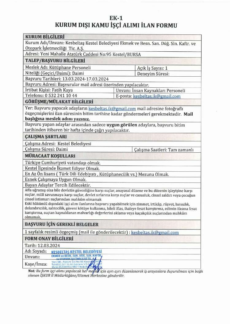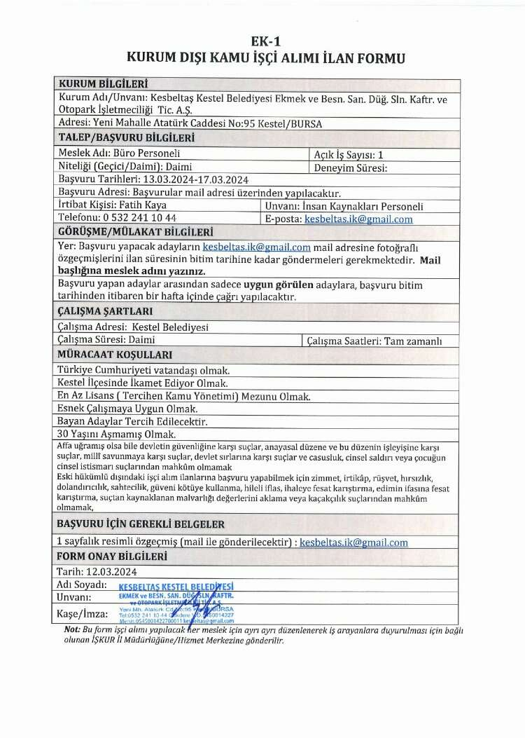Kestel Belediyesi bünyesinde tam zamanlı ve daimi süreli işçi personel alımı için başvuruda bulunacak adaylar, resimli bir sayfalık özgeçmiş (CV) belgelerini kesbeltas.ik@gmail.com adresine iletmeleri yeterli olacak.