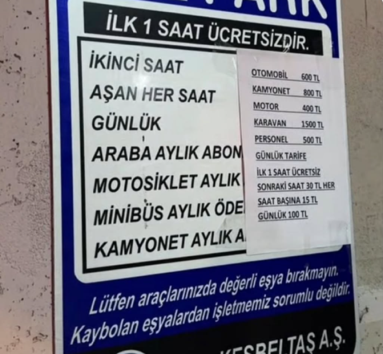 Kamyonetlerin aylık otopark ücreti ise 800 TL olarak belirlenirken, karavanlar için bu ücret 1500 TL’ye çıktı.