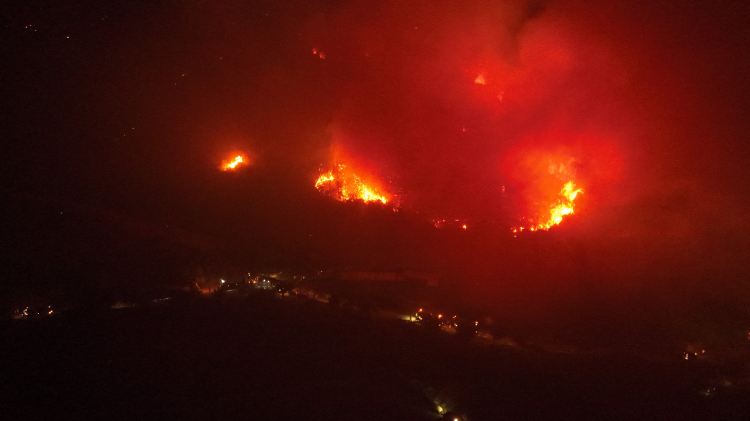 Yangının dron ile havadan kaydedilen görüntülerinde ise gecenin karanlığı adeta kızıla boyandı. Çam ağaçları alev alev yanarken, bazı noktalarda itfaiye ve orman ekipleri müdahalede bulundu. Rüzgarın zaman zaman hızını arttırması ekiplerin de işini zorlaştırdı. 3 köyde 1765 kişinin tahliye edildiği açıklandı.