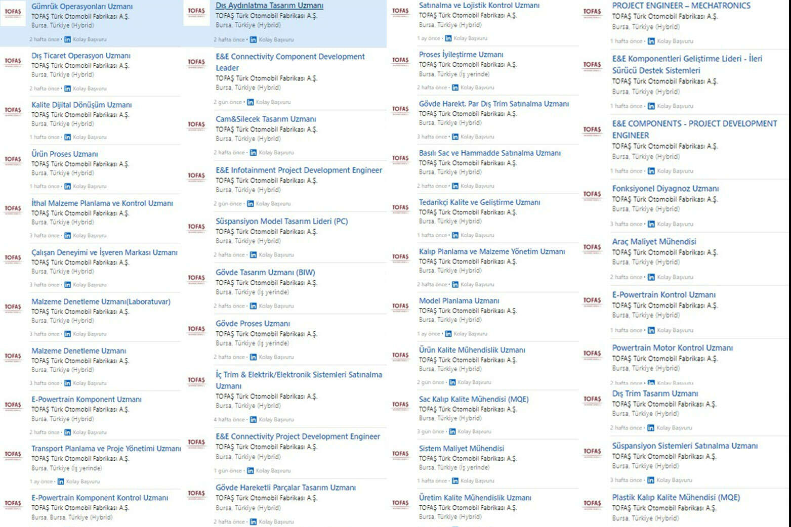LinkedIn'de yayımlanan ilanlara göre; Bursa'da gümrük operasyonları uzmanı, dış ticaret operasyon uzmanı, Fiat pazarlama dijital iletişim yönetmeni, kalite dijital dönüşüm uzmanı, ürün proses uzmanı, ithal malzeme planlama ve kontrol uzmanı, çalışan deneyimi ve işveren markası uzmanı, malzeme denetleme uzmanı (laboratuvar), ikinci el operasyonları destek ve raporlama uzmanı, malzeme denetleme uzmanı, e-powertrain komponent uzmanı, transport planlama ve proje yönetimi uzmanı, satınalma ve lojistik kontrol uzmanı, proses iyileştirme uzmanı, gövde hareketli parçalar trim satın alma uzmanı, basılı sac ve hammadde satınalma uzmanı, tedarikçi kalite ve geliştirme uzmanı, kalıp planlama ve malzeme yönetimi uzmanı, model planlama uzmanı, ürün kalite mühendislik uzmanı, sac kalıpmühendisi (MQE), sistem maliyet mühendisi, üretim kalite mühendislik uzmanı, dış trim tasarım uzmanı, süspansiyon sistemleri satınalma uzmanı, plastik kalıp kalite mühendisi (MQE), dış aydınlatma tasarım uzmanı, Q&Q connectivity componenent development leader, cam & silecek tasarım uzmanı, E&E ınfortainment project development engineer, süspansiyon model tasarım lideri (PC), gövde tasarım uzmanı (BIW), gövde proses uzmanı, iç trim & elektrik/elektronik sistemleri satınalma uzmanı, E&E connectivity project development engineer, gövde hareketli parçalar tasarım uzmanı, project engineer- mechatronics, E&E komponentleri geliştirme lideri-ileri sürücü destek sistemleri, E&E components-project development engineer, fonksiyonel diyagnoz uzmanı, araç maliyet mühendisi, e-powertrain kontrol uzmanı, powertrain motor kontrol uzmanı alınacak.