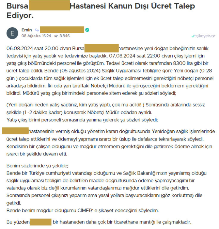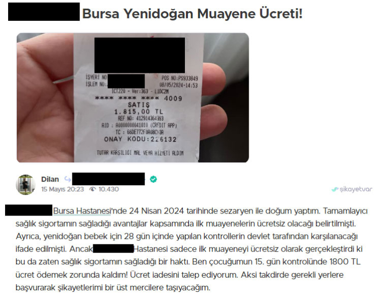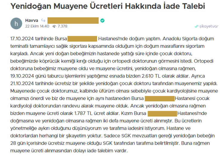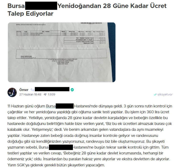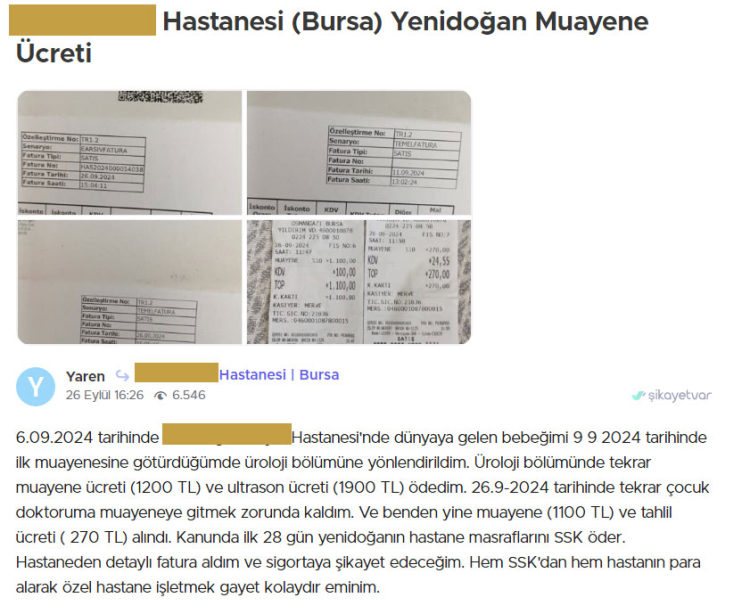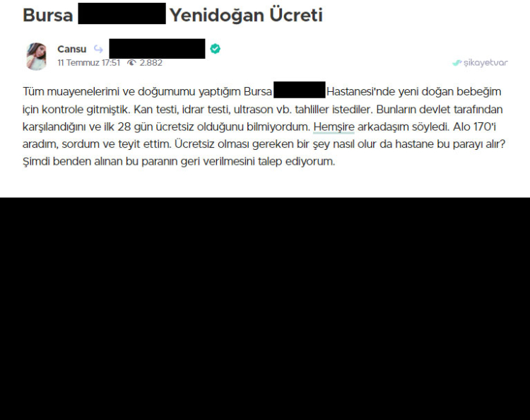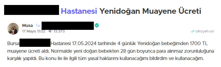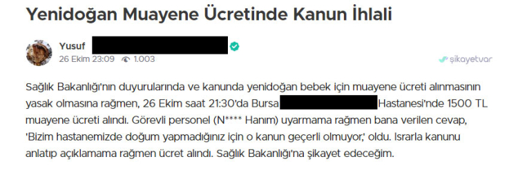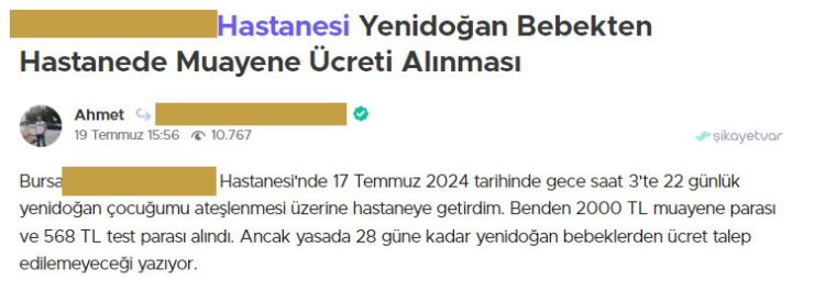 Çeşitli platformlar üzerinden yayımlanan şikayetlerde; ilk 28 gün ücretsiz olmasına rağmen özel hastanelerin anne-babalardan ücret talep ettiği iddia edildi.