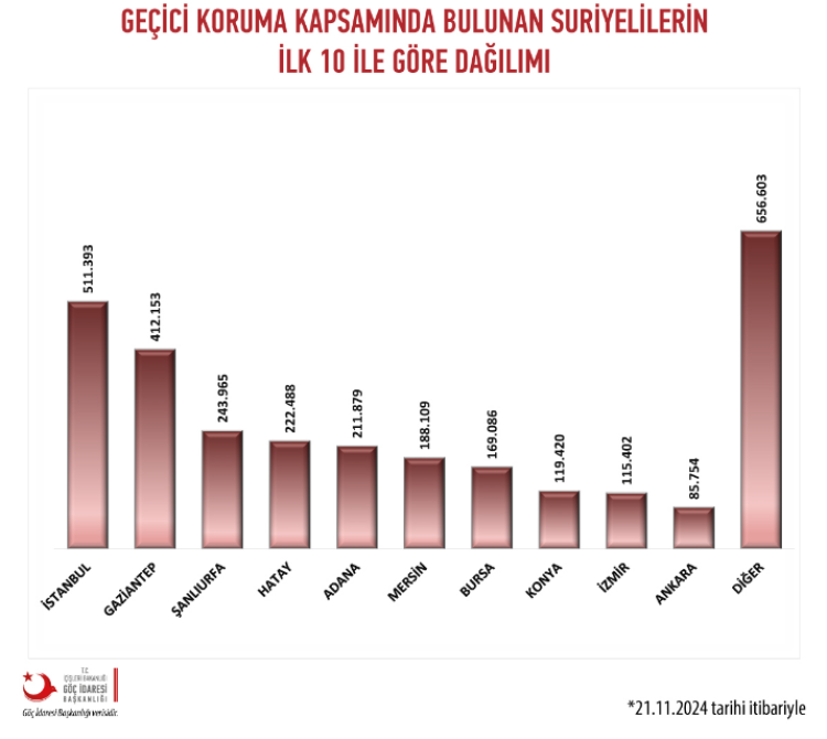İçişleri Bakanlığı Göç İdaresi Başkanlığı, geçici koruma çerçevesinde Bursa'da yaşayan Suriyelilerin sayısını açıkladı.