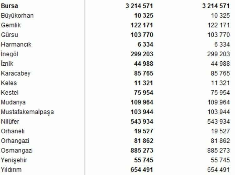 Türkiye İstatistik Kurumu (TÜİK), farklı illerin kütüğüne kayıtlı olup Bursa'da yaşayan vatandaşların sayısını açıklamıştı. TÜİK'in yayımladığı Adrese Dayalı Nüfus Kayıt Sistemi (ADNKS) sonuçlarına göre, Bursa'da 45 bin 289 Ağrılı, 69 bin 463 Artvinli, 57 bin 433 Balıkesirli, 19 bin 415 Çorumlu, 44 bin 703 Diyarbakırlı, 152 bin 875 Erzurumlu, 41 bin 978 Giresunlu, 28 bin 376 İstanbullu, 34 bin 983 Karslı, 105 bin Muşlu, 93 bin 470 Samsunlu, 52 bin 492 Trabzonlu, 36 bin 686 Vanlı ve 32 bin 983 Ardahanlı yaşıyor.